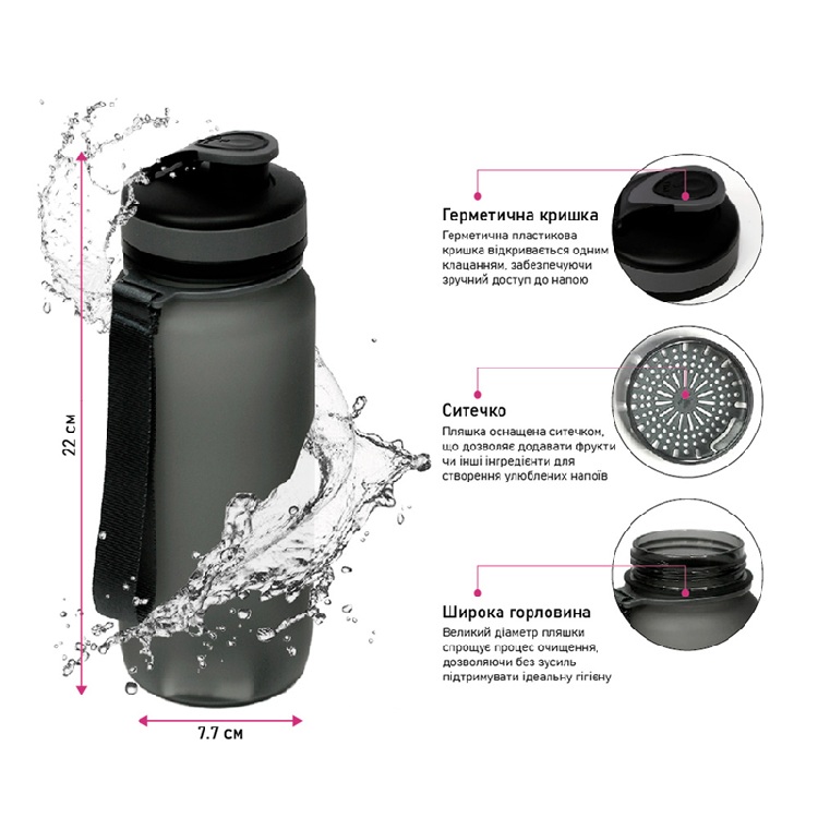 Матовый корпус обеспечивает стильный вид и приятные тактильные ощущения при использовании. Большой диаметр бутылки упрощает процесс очистки, а прочный ремешок обеспечивает удобство при переноске.