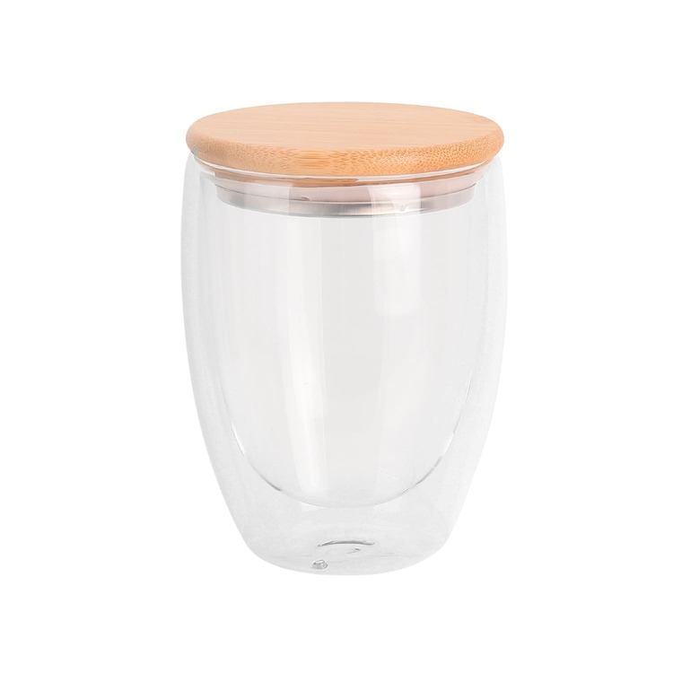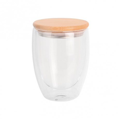 Стакан с двойными стенками из высококачественного боросиликатного стекла и крышкой из бамбука с силиконовым кольцом. Вместимость 350 мл.