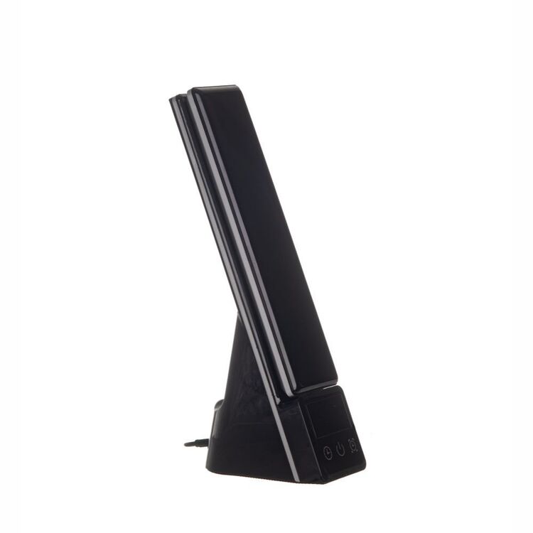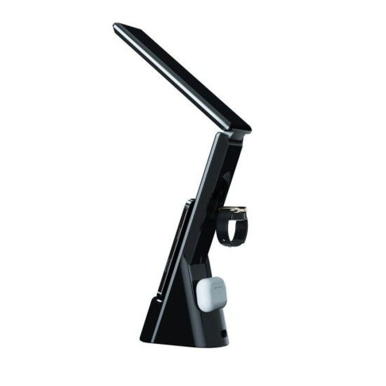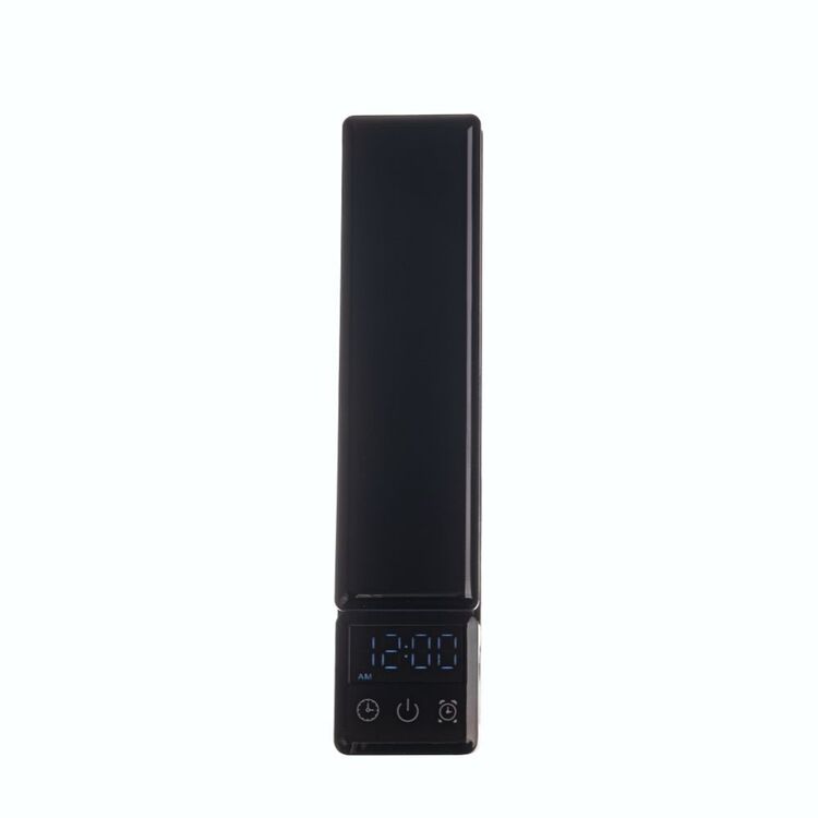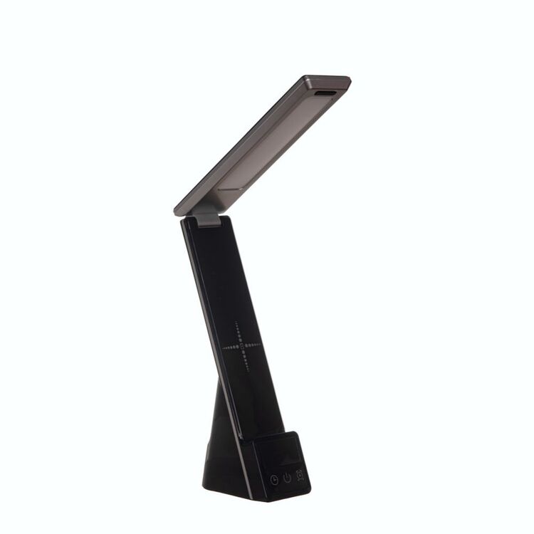 Модель оснащена подвижной конструкцией с регулировкой высоты и угла света, работает в 3 режимах освещения: теплый, белый и теплый белый свет. Сенсорное управление и LCD-дисплей с часами расположены на ножке лампы.