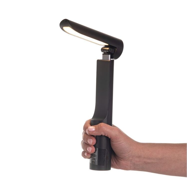 Высоту телескопического держателя можно регулировать: в сложенном виде – 200 мм, в разложенном – 350 мм. Также регулируется угол наклона светильника. Сверху осветительный элемент защищен плафоном, чтобы свет не бил в глаза.