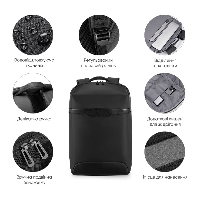 Рюкзак для ноутбука 15,6” и планшета. Ткань водонепроницаемая 100% полиэстер + полиуретан, имеет основной большой отдел, отдел для ноутбука и планшета, два кармана органайзера, ремень для чемодана. Размер 46 х 32 х12 см.