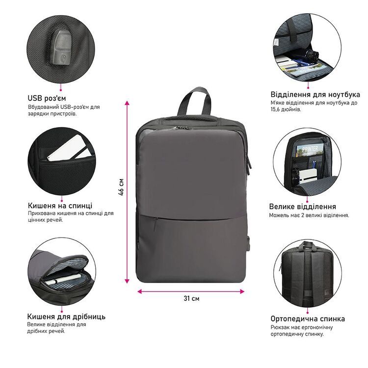 Модель имеет два больших отделения, фронтальный карман и скрытый карман на спинке. Внутри есть органайзеры для аксессуаров и мягкое отделение для ноутбука. Благодаря эргономичным лямкам и усиленной спинке рюкзак удобен даже при длительном ношении.