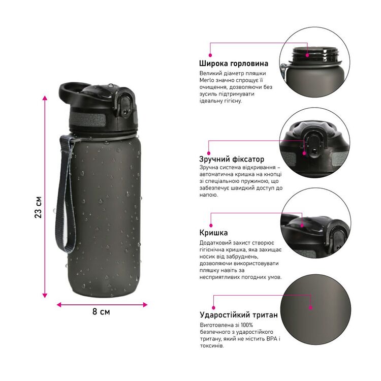 TPR-вставки на боках кришки забезпечують надійне утримання та комфортне відкривання навіть мокрими руками. Завдяки широкому горлечку пляшка легко миється та швидко наповнюється.