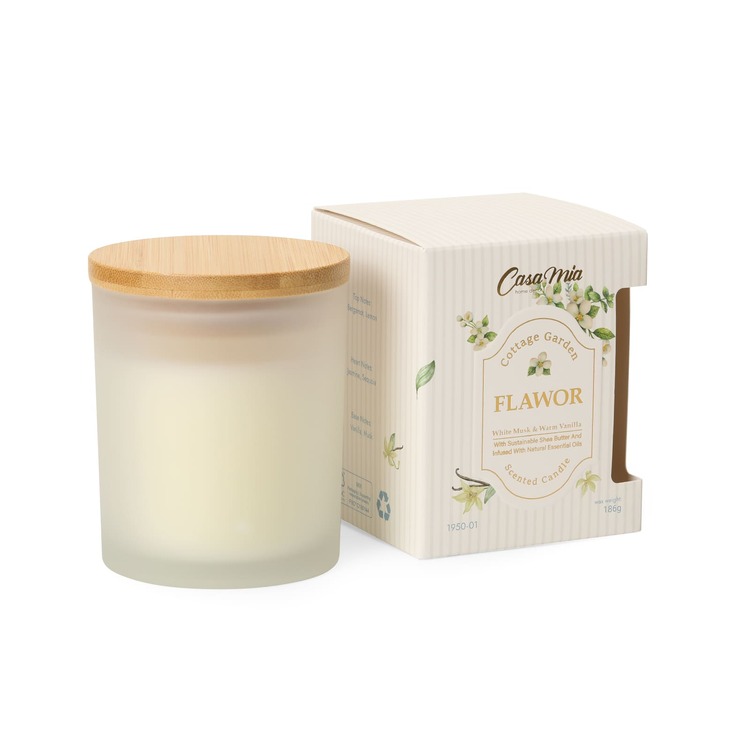 Свічка ароматична Flawor з натуральними ефірними оліями. Об'єм воску: 186 г. Матеріал: скло, дерево, парафін 1950 "White Musk & Warm Vanilla": Верхні ноти: бергамот, лимон Серцеві ноти: жасмин, секвойя Базові ноти: ваніль, мускус. 1950 "Dark Rum & Rose": Верхні ноти: малина, чорна смородина Серцеві ноти: троянда, персикова квітка, ром Базові ноти: сандалове дерево, мускус, ваніль.
