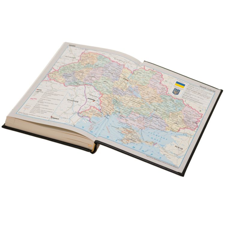 Блок - кремовий папір 90 г/м², одна закладка, прошитий корінець щоденника, перфоровані аркуші, чистий передній форзац, нахзац - карта України. Кількість сторінок - 352.