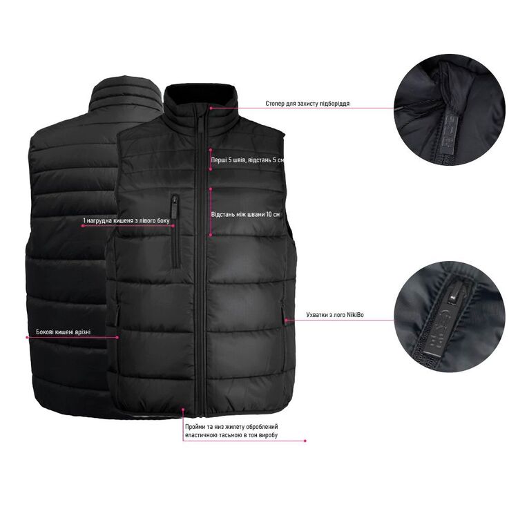 Жилет Nikibo Flow — стильна модель унісекс для корпоративного стилю та щоденного використання. Водовідштовхуючий матеріал і продуманий крій забезпечують комфорт у прохолодну погоду. Завдяки різній відстані між швами жилет виглядає сучасно та зберігає достатню площу для брендування корпоративним логотипом. Практичні кишені й акуратні деталі роблять його зручним для активного використання. Нагрудна кишеня на блискавці має продуману місткість — у ній легко поміститься навіть смартфон формату Pro Max.
